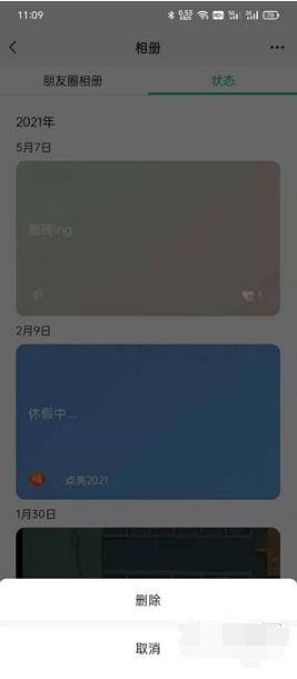 5、如果需要删除历史状态,长按某个状态,在弹出的选项中点击【删除】(不可批量操作)。