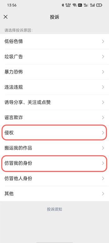6、然后选择投诉原因,选择【侵权】或【冒充我的身份】进入;