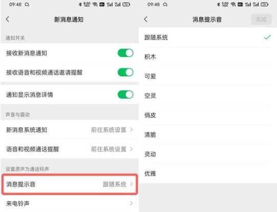 5、“设置原音为来电铃声”下,分别有消息提示音和来电铃声设置。消息提示音可以按照系统设置,可以使用微信提供的铃声;