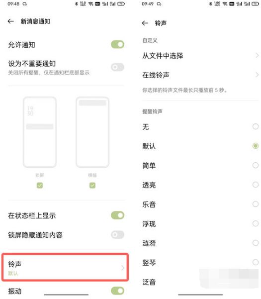 4. 点击“声音和振动”下的设置,跳转至系统设置。点击【铃声】,选择系统提供的铃声。您还可以选择在线铃声或自定义铃声;
