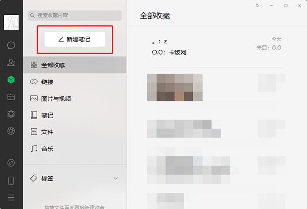 1.电脑端微信目前不支持将收藏夹转为笔记,只能直接新建笔记并点击左侧进入【收藏夹】;