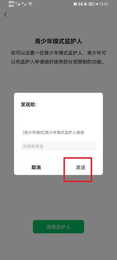 3.点击后会跳转到微信联系人列表。我们需要找到自己的监护人,然后点击发送监护人邀请消息;