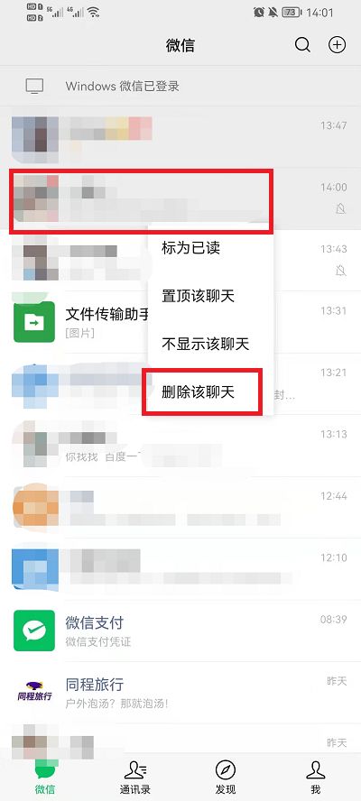 3、如果您想删除与该好友的所有聊天记录,只需长按聊天列表中的聊天对话框,就会弹出删除功能选项。点击【删除】即可删除与该好友的所有聊天记录。