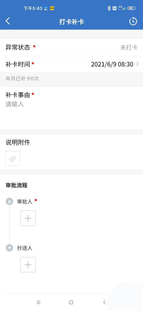 3.点击缺卡日期,点击补卡申请,填写信息并提交申请。