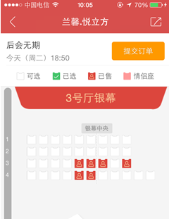 5. 下一步是选择座位。选择后,直接提交订单。提交订单后,就相当于进行了预订。如果15分钟内未付款,预订将被取消。
