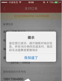 6. 付款后,购票成功。您可以去电影院取票。您可以直接输入手机收到的验证码,即可轻松成功取票。