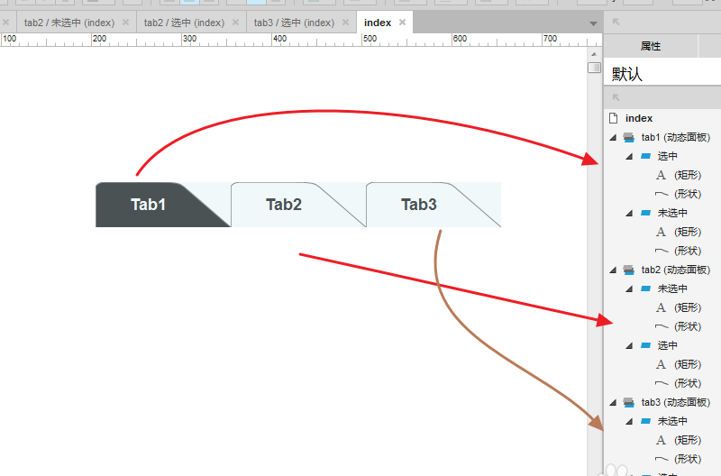 ? 6、复制三个“tab1”组件,将文字改为:tab1/tab2/tab3,命名,并将tab2/tab3的选中状态设置到后面: