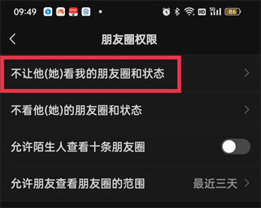 5、朋友圈的权限中,有四个功能可以设置朋友圈的可见性。我们点击【不要让他/她看到我的朋友圈和状态】;