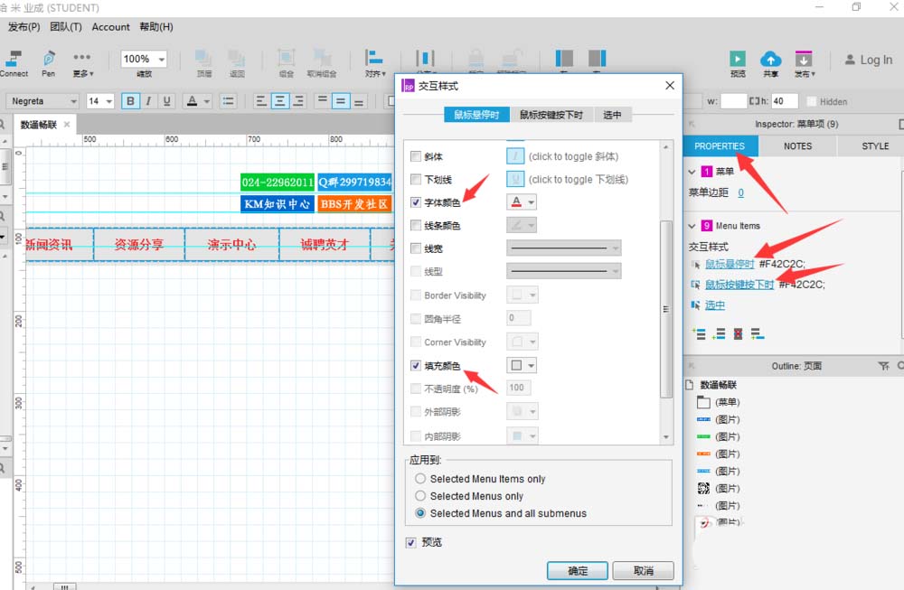 ? 4、导航编辑完成后,为其添加鼠标移动效果,如下图: