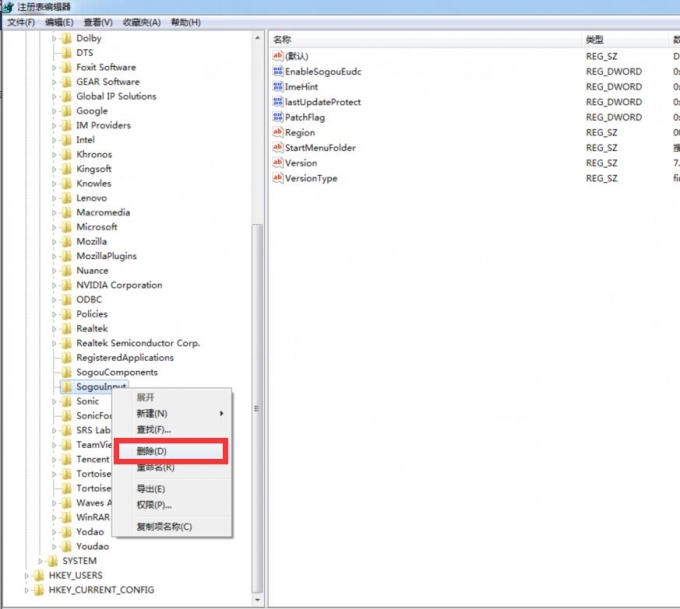 ? 2、根据指定路径找到需要删除的sogouinput项。到