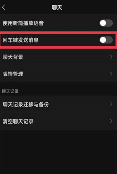 当我们进入聊天设置后,然后我们点击回车键发送消息,然后打开右侧的滑块。