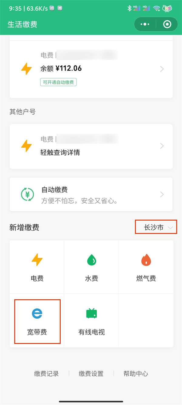 3.选择支付城市,找到并点击进入【宽带费】。