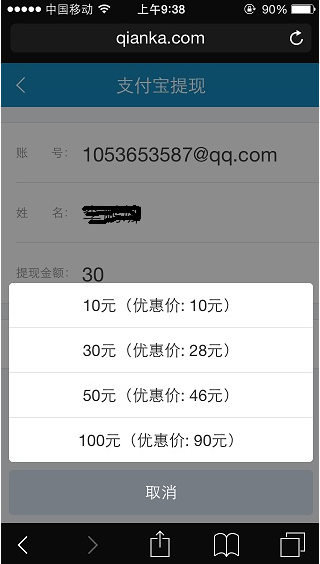 3.接下来填写支付宝账号和姓名。以小编的支付宝账号为例(当然我觉得小编对你有帮助,我也不介意你给我打赏)。可以看到,提取的现金越多,折扣就越好。高,也就是说你提款30块钱,你的钱卡账户上就会扣掉28块钱,这个还不错。