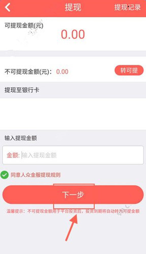 2、在【提现】页面,填写提现金额后,点击【下一步】按钮;