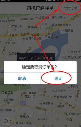 7.当然,如果叫了司机但你不想去,你可以点击取消订单,然后系统会提示你是否确定取消。我们可以点击“确定”来取消订单。当然,既然已经下单了,想要取消订单的时候一定要和司机仔细沟通。