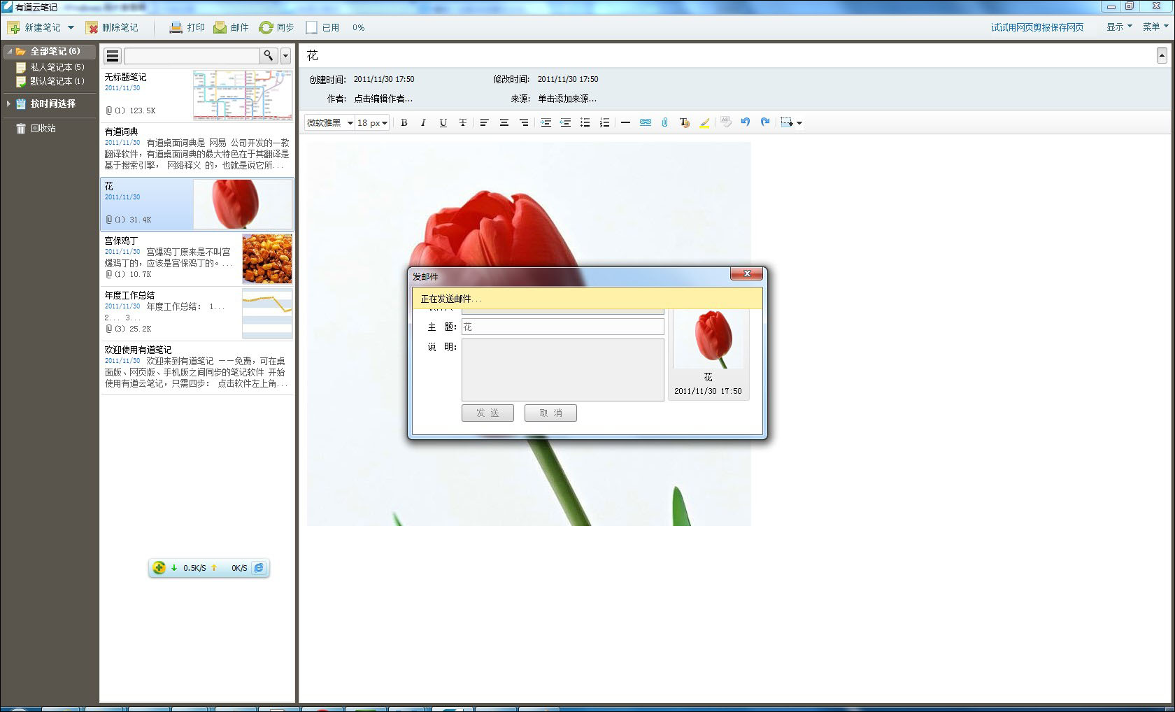 有道云笔记1.3及以后版本支持以电子邮件的形式向他人发送笔记(图1),并且笔记附件自动转换为电子邮件附件,无需更多的排版和操作,也无需重复复制粘贴,内容共享非常方便方便的。到