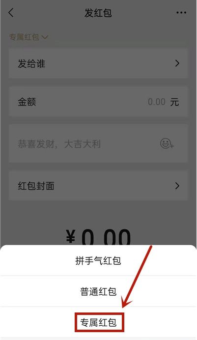 2.在红包发送页面左上角选择【专属红包】。