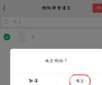 5、进入删除群组管理员页面后,勾选需要删除的管理员,点击右上角【删除】;