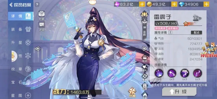2、我们先来看看《觉醒雷震子》的整体情况。图中的速度是11760,这说明她的基础速度相当不错,而且因为可以拿到箱子、精英、特殊币,所以她拥有50星的能力,速度等属性都比氪金卡。