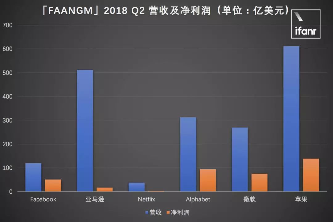 从数据本身的规模来看,苹果的整体营收依然处于航母级别,138亿的利润也让人羡慕不已。在比较营收和利润时,国外习惯将“FAANG”这五家公司(即Facebook、亚马逊、苹果、Netflix和谷歌母公司Alphabet)放在一起比较。此外,我们还比较了最近公布的新季度财报的微软。添加到比较中。从下图我们可以看到,苹果在营收和利润方面依然首屈一指。