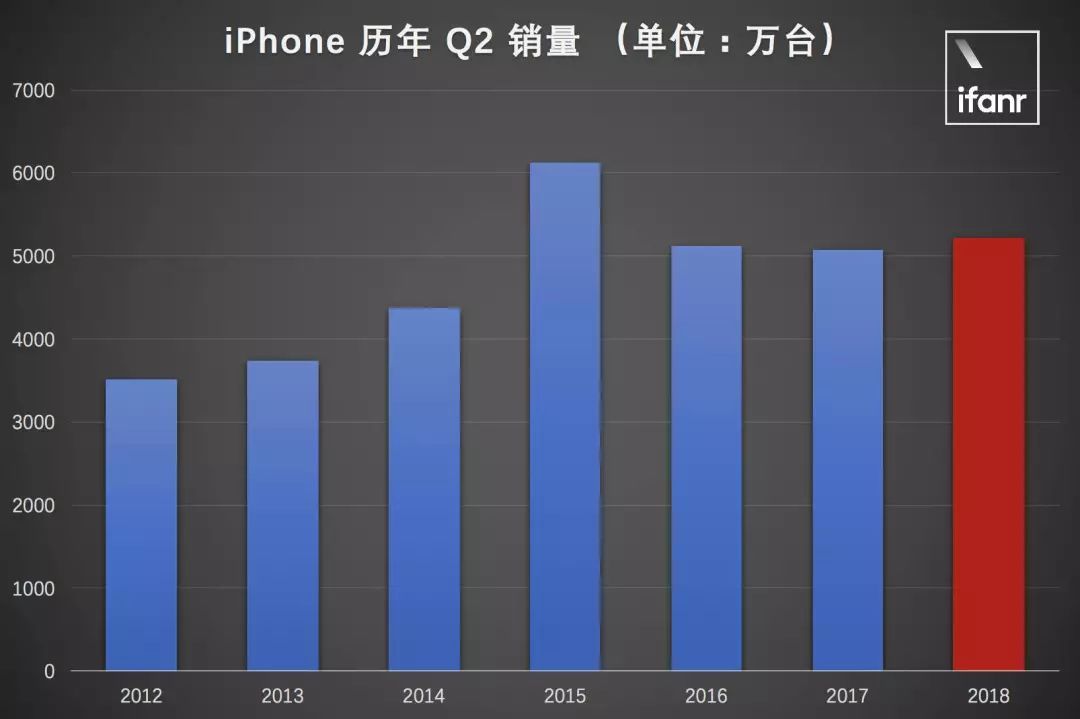 苹果第二季度售出了5221.7 万部iPhone。虽然环比下降超过32%,但由于iPhone等手机产品受季度影响较大,一般只比较同比。历年Q2 iPhone销量中,2018年Q2销量虽然不如2015年,但依然取得了历史第二好的成绩,比上年同期增长了3% 。