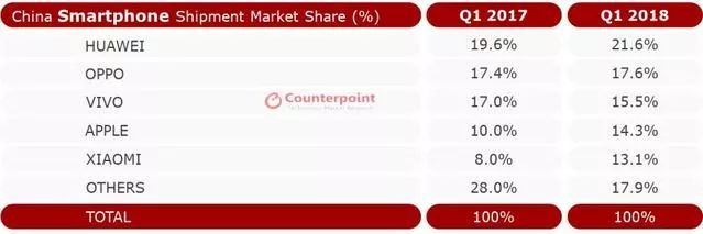值得一提的是,根据Counterpoint最新市场监测研究显示,2018年第一季度中国智能手机出货量放缓,同比下降8%,环比下降21%。在整体市场疲软、国产手机品牌围攻的情况下,苹果在中国的市场份额以14.3%占据第四位,较去年同期增长4.3个百分点。