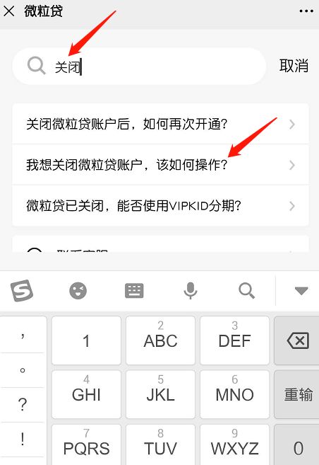 4. 单击搜索框图标。输入“关闭”。找到选项“我想关闭我的微利贷账户”。