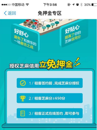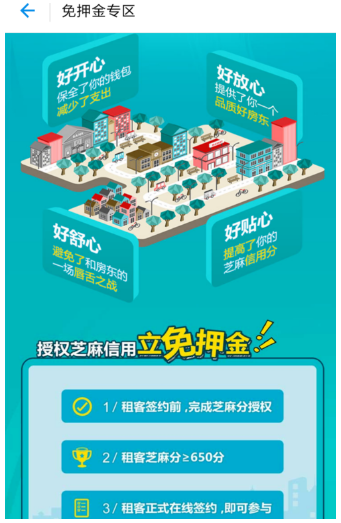 3、开出租屋。右上角有芝麻码免费押金。点击后,中间可以看到有纸纸分650出租免押金。
