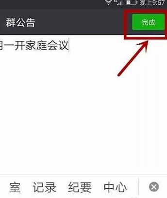 4、进入群组公告后,空白区域就是您要填写的群组内容。群组内容不支持图片格式,只能用文字编辑。编辑完成后,点击右上角绿色的“完成”按钮。