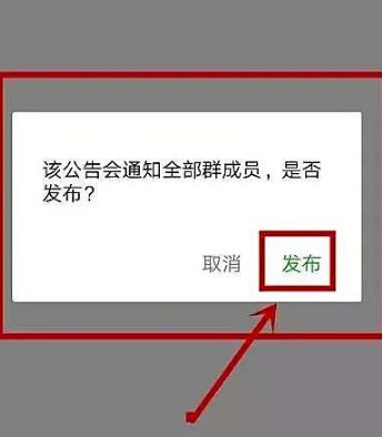5、点击“完成”按钮后,会弹出提示框,内容为:该公告将通知所有群成员是否发布。点击“公开发布按钮”@本微信群内的所有人即可完成。