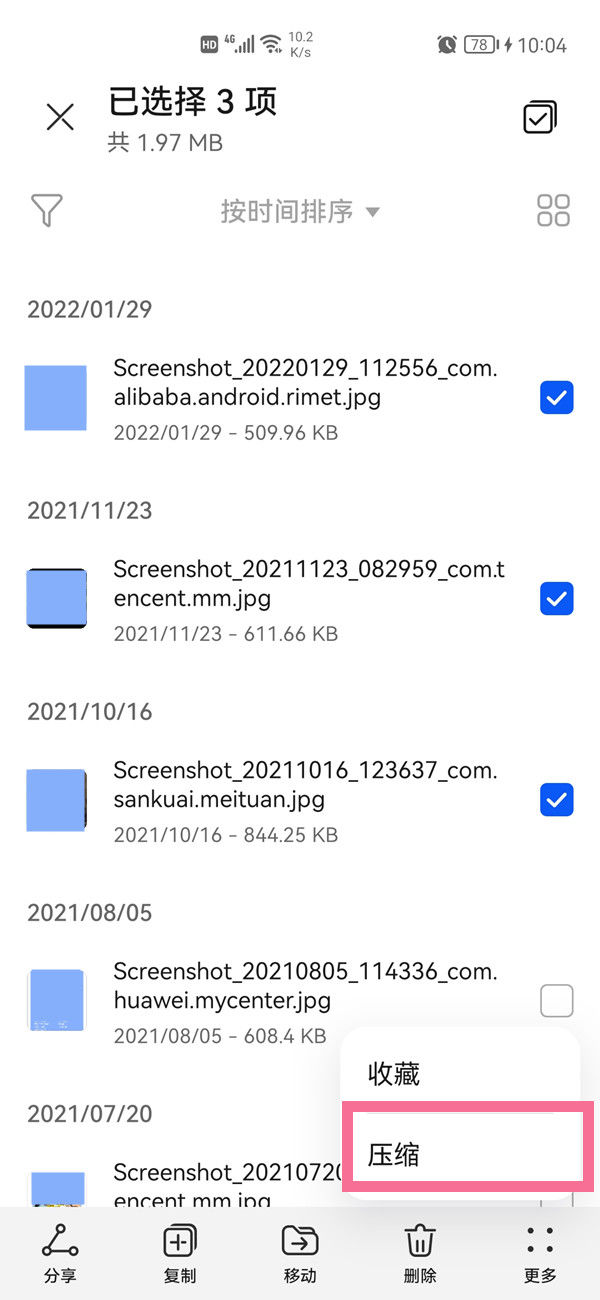 3.选择微信聊天记录截图,找到【更多】,点击【压缩】。