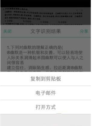 识别完成后,您可以导出文本并点击“分享”。共享有三种方式:复制到剪贴板、通过电子邮件发送和打开。整个过程非常快,效率提高了不少。