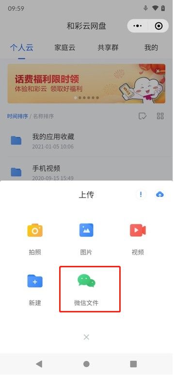 2.点击上传,选择微信文件,然后上传需要上传的文件。