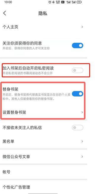 3、首先点击上方的【添加书架后自动开启私人阅读】并开启,然后点击下方的替代书架并进行设置。