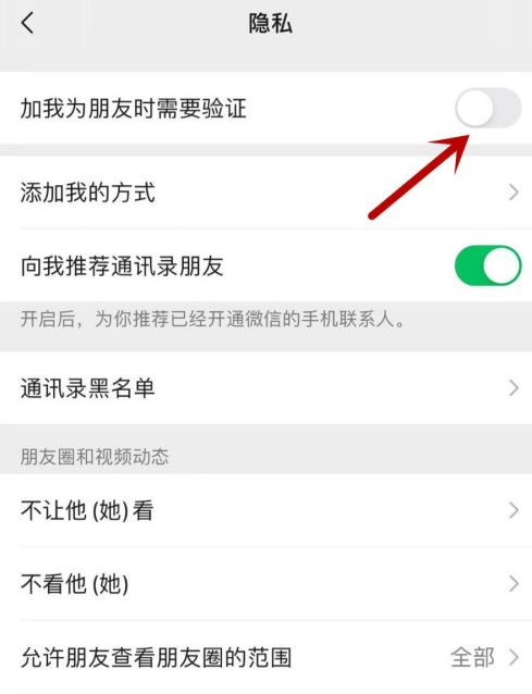 5、跳转到新页面后,点击【添加我为好友时需要验证】右侧的灰色按钮。