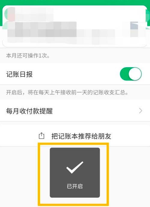 5、账本“设置”主页面会弹出“已启用”提示信息,则微信账单同步到账本已成功启用。