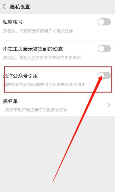 5、进入隐私设置后,点击关闭允许公众账号引用,禁止公众账号引用。根据需要设置。
