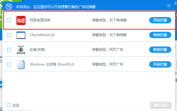 3、然后在弹窗中找到“网易有道词典”并拦截;