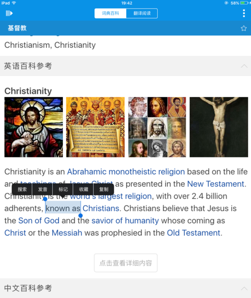 2.新版Olucha单词模块词典链接英文版维基百科。这是一个非常好的资源,可以在单词搜索界面上阅读。在此界面中,如果您要查找的单词不在链接中,只需单击一次,就会弹出其含义。如果该单词在链接中,则点击一下会跳转到新的页面,需要在单词搜索输入框中点击该单词才能返回。查询链接中的单词的方法是长按旁边未链接的单词,滑动到要搜索的单词并离开手指。这时,只要点击弹出菜单上的“搜索”按钮,就会弹出一个解释界面。到