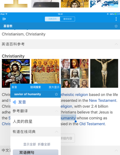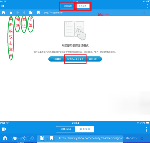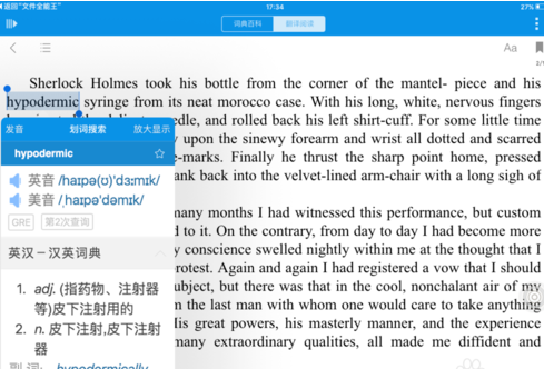 1、奥卢词典的阅读模块支持网页和电子书(.EPUB、.DOC、.PDF),并与查词模块无缝对接。这些格式有很多好的阅读资源。以前在IOS(苹果)手机和iPad上使用奥卢词典跨软件查词非常方便。 iOS9禁止内部复制,单词查找变得更加麻烦。奥卢词典的阅读模块中,阅读时遇到生词,只需手指一指,解释界面就会弹出该词的意思,非常方便