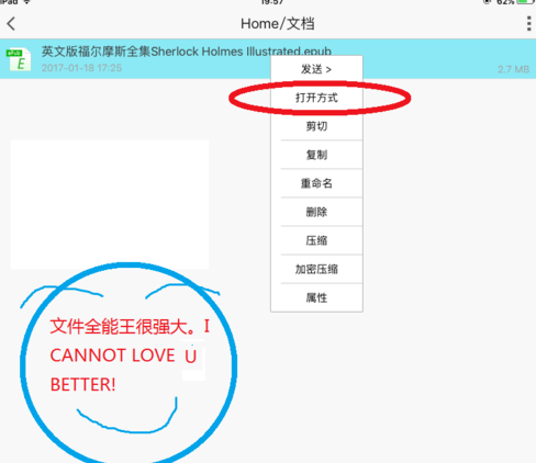 5.您还可以在奥卢词典的阅读模块中阅读电子书。阅读前,电子书必须上传至奥卢词典。上传电子书有两种方法。一种是使用欧陆自带的WIFI传输模块上传,另一种是使用第三方软件,比如功能强大的免费软件“文件全能王”导入。首先将电子书文件上传到全能文件文件夹下,长按文件,选择“打开方式”,然后选择“复制到奥卢词典”,然后就可以在奥卢中打开阅读了。到