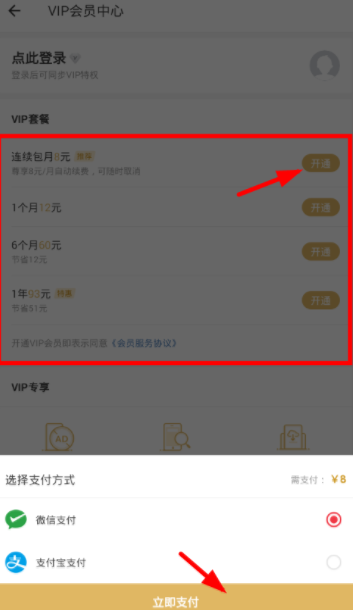 4、这样,只要选择你想开通的套餐,就可以直接付费开通会员,避免广告。到