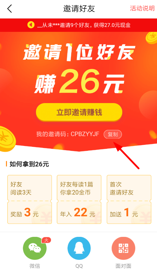 3、对此感兴趣的朋友还可以通过“邀请好友”功能复制自己的邀请码,让其他人注册今日头条快车版并填写邀请码,即可获得现金福利!