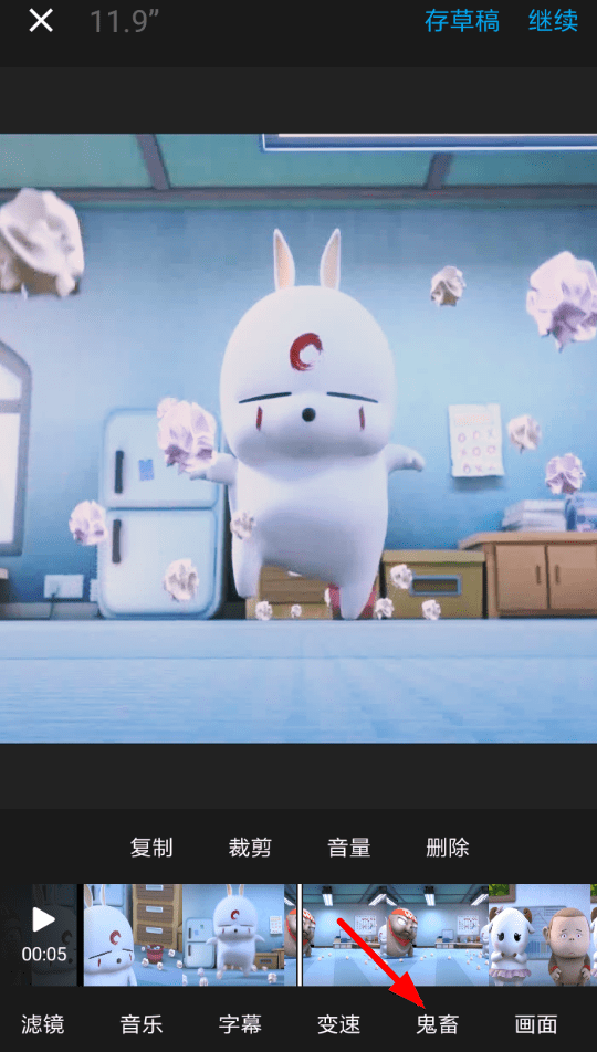 2.成功编辑视频素材并打开视频的编辑页面后,我们可以从下面的列表中找到“幽灵动物”功能进行设置。到