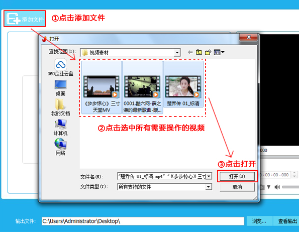 进入视频批量截取界面,点击左上角“添加文件”,在弹出框中选择视频文件。您可以在这里批量添加它们。只需按住快捷键ctrl+a,然后单击“打开”即可。