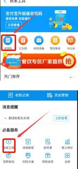 2、接下来,在商户服务页面,选择“商户工具”功能选项,点击进入,然后进入商户工具页面,选择箭头所指的“付款码”。