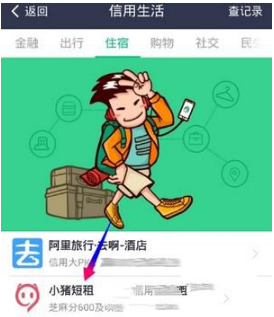 进入信用生活区,点击选择【生活】栏目,再点击选择【小猪短租】;