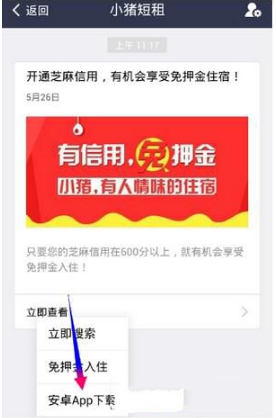 新增小猪短租服务窗口,点击下方【发现短租】-【安卓APP下载】;