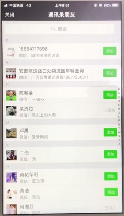 4、最后我们点击通讯录联系人右侧的【添加】进行添加。
