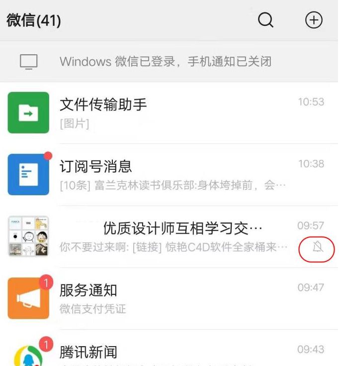4.然后返回主页。您可以看到该组后面有一个带有斜线的灰色铃铛。这是当前的消息“请勿打扰”标志。有了这个标志,就意味着可以接收该组之后的消息,但不会提醒。